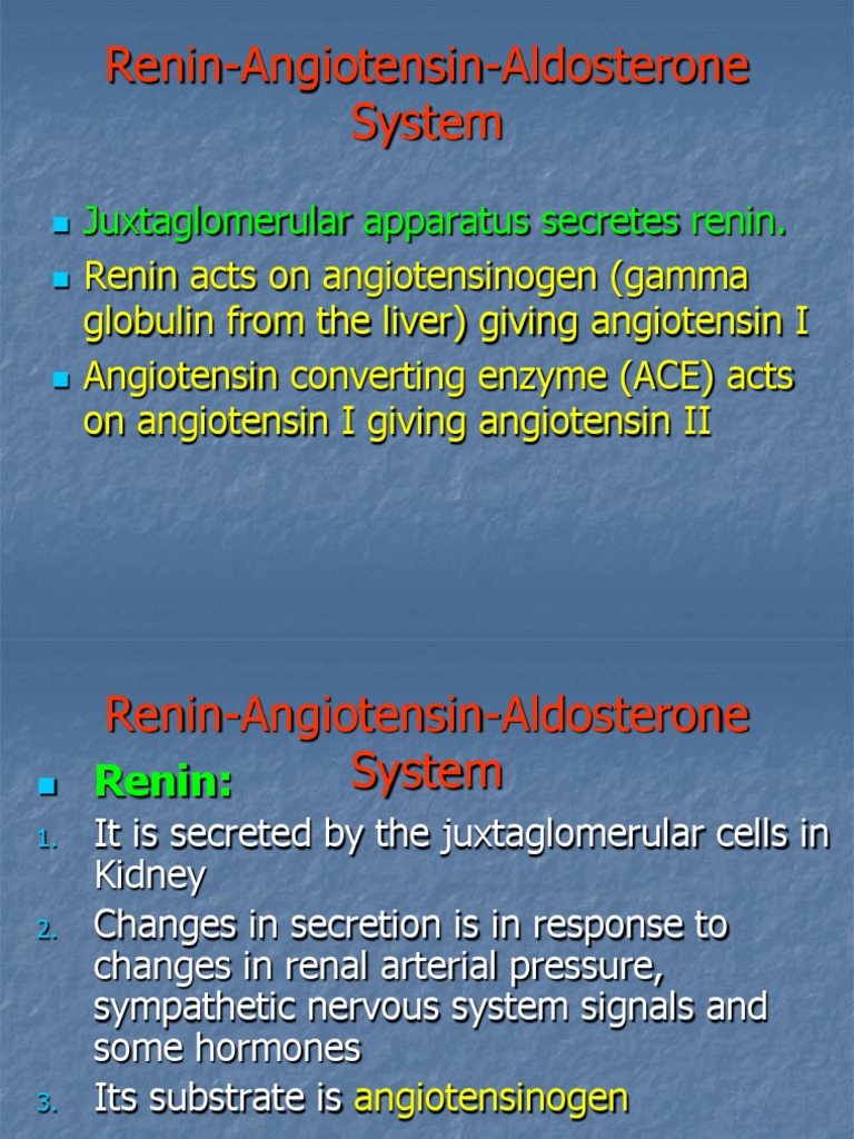 Thank you for 'paying with a tweet' for this ppt slide. Angiotensin converting enzyme (ace) is also known as kinanase ii it converts angiotensin i to ii (vasoconstrictor) and inactivates bradykinin. Renin angiotensin aldosterone system in progressive kidney disease telmisartan 80mg added to ramipril 10mg: It is comprised of the three hormones renin, angiotensin ii and aldosterone and regulated primarily by renal blood flow. Neutel jm, mancia g, black hr, et al.